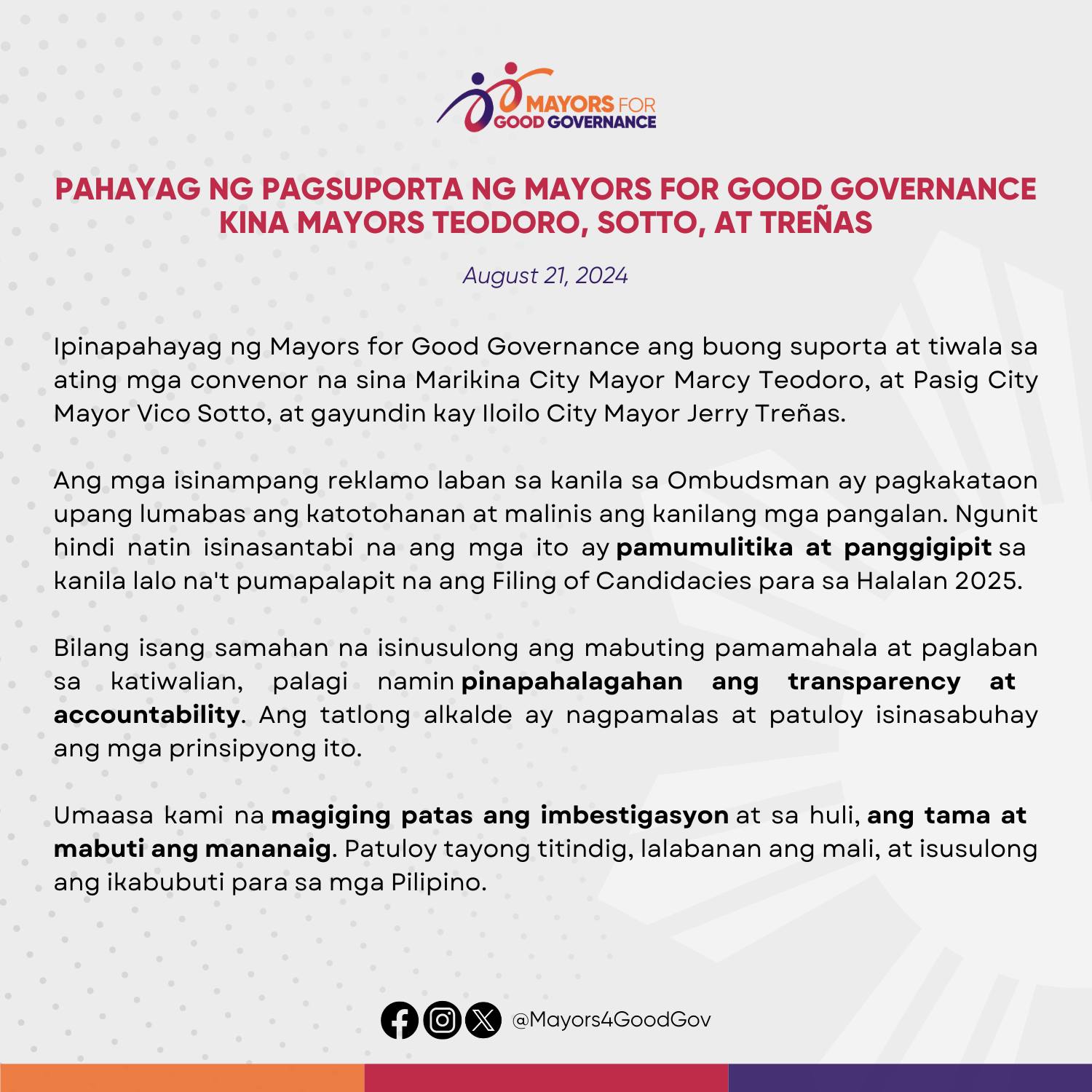 Ipinapahayag ng Mayors for Good Governance ang buong suporta at tiwala sa ating mga convenor na sina Marikina City Mayor Marcy Teodoro, at Pasig City Mayor Vico Sotto, at gayundin kay Iloilo City Mayor Jerry Treñas.